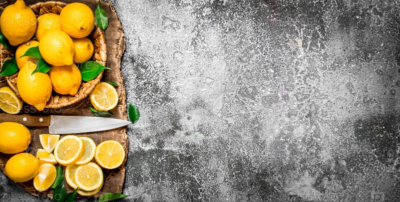 Свежие лимоны в корзине с ножом на разделочной доске