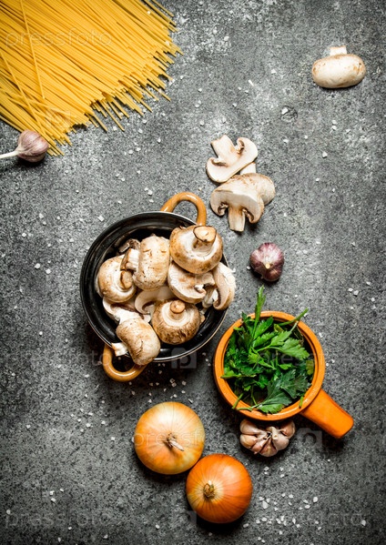 Спагетти с шампиньонами, луком и зеленью петрушки