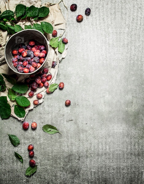 Спелые сливы с зелеными листьями
