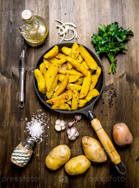 Сковорода печеного картофеля со специями, солью, маслом, травами и чесноком