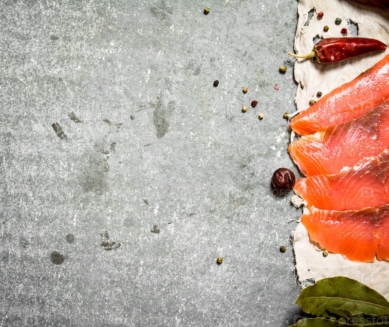 Тонкие ломтики лосося на старой ткани