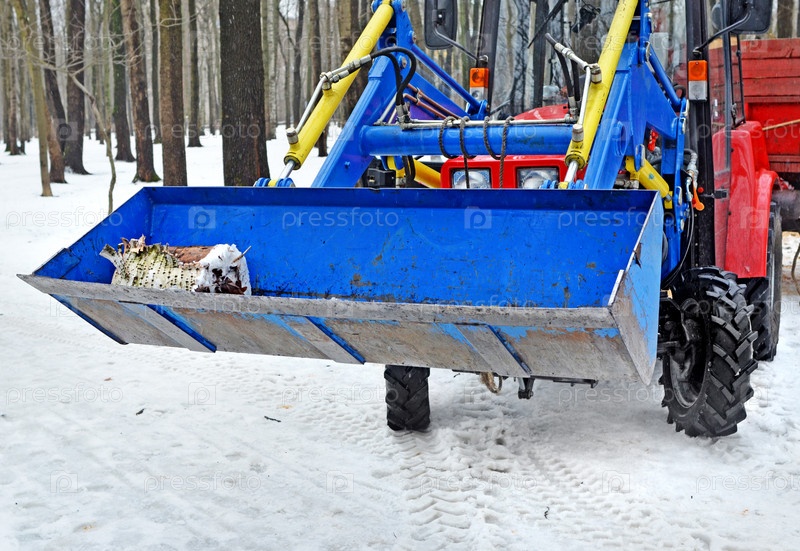 Трактор-погрузчик в лесу зимой
