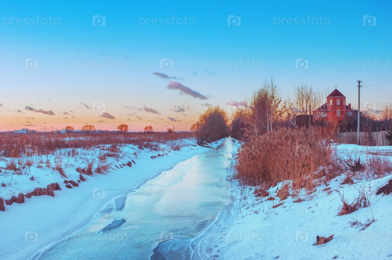 Зимний сельский пейзаж на закате
