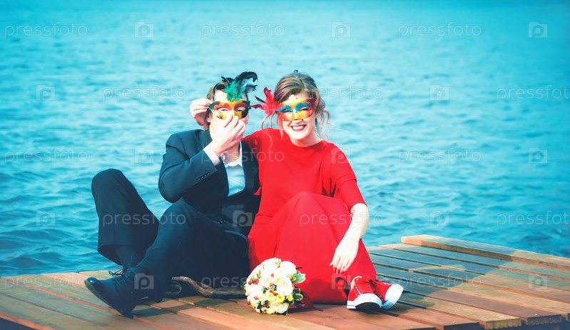 Счастливая пара в маскарадных масках