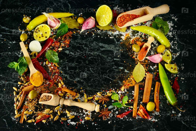 Разнообразие специй и трав на кухонном столе