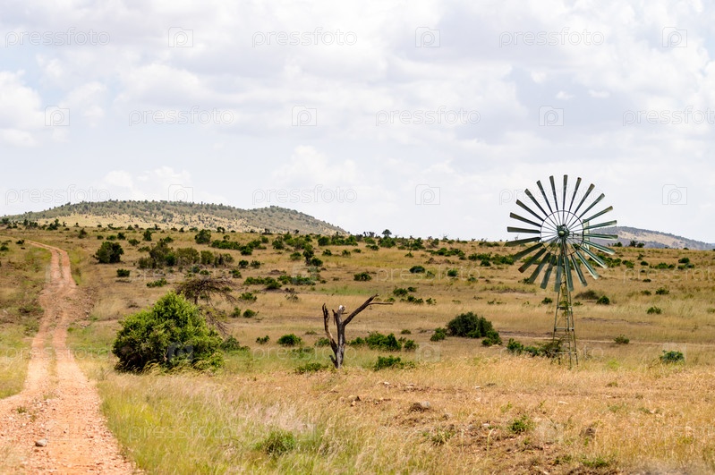 Водяной насос питается от ветровой турбины в саванне в Масаи Мара парка в Кении
