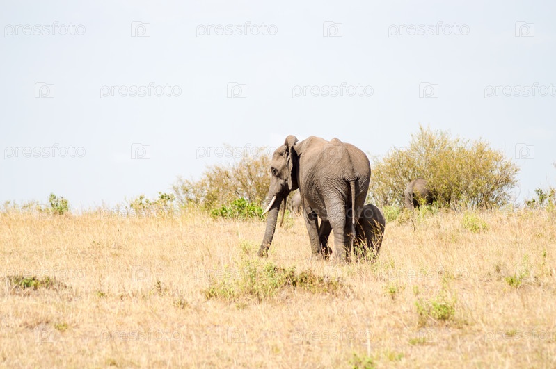 Слон и слоненок в саванне Мары парке на северо-западе Кении