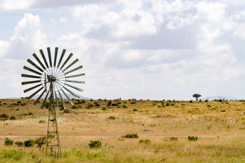 Водяной насос питается от ветровой турбины в саванне в Масаи Мара парка в Кении