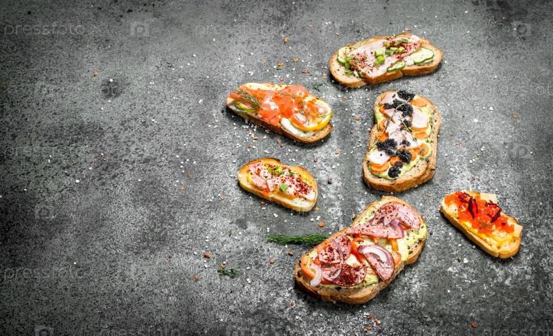 Бутерброды с мясом, колбасой, морепродуктами и свежими овощами