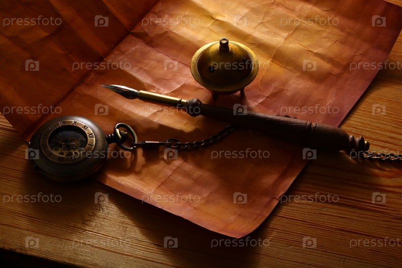 Перо с карманными часами на бумаге