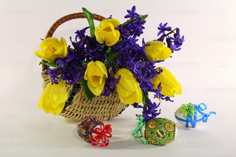 Корзинка с весенними цветами и пасхальными яйцами