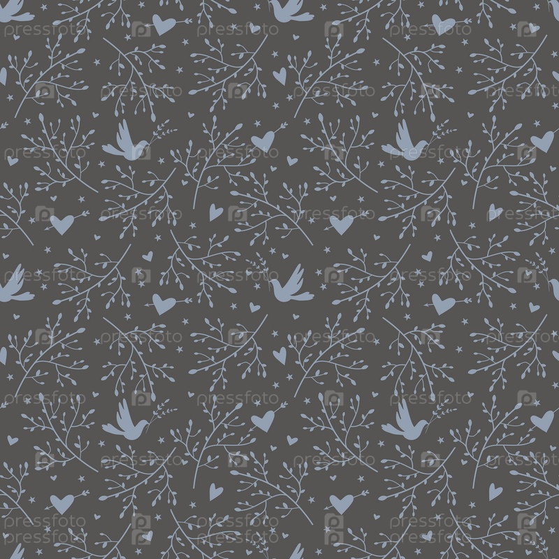 Бесшовный узор с птицами, ветвями и сердцем