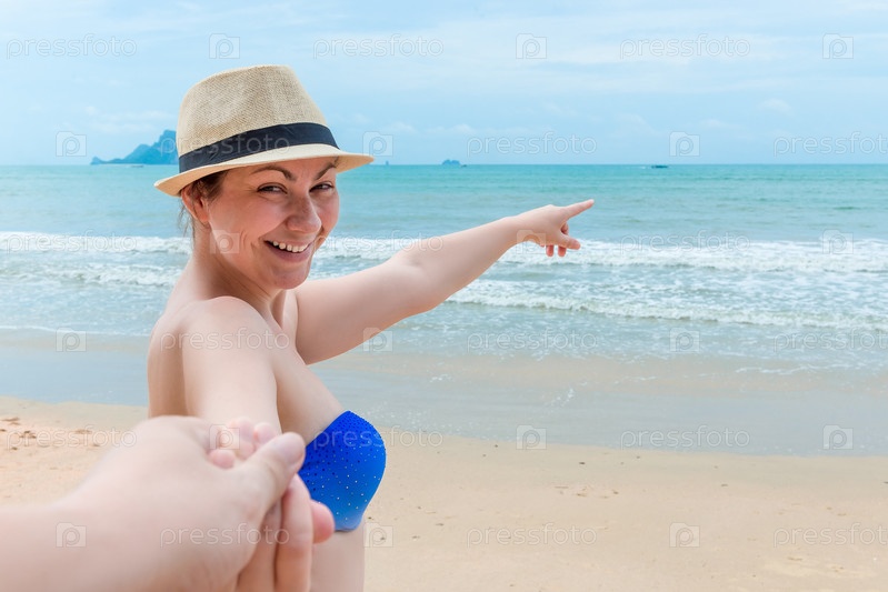 Счастливая женщина показывает в море