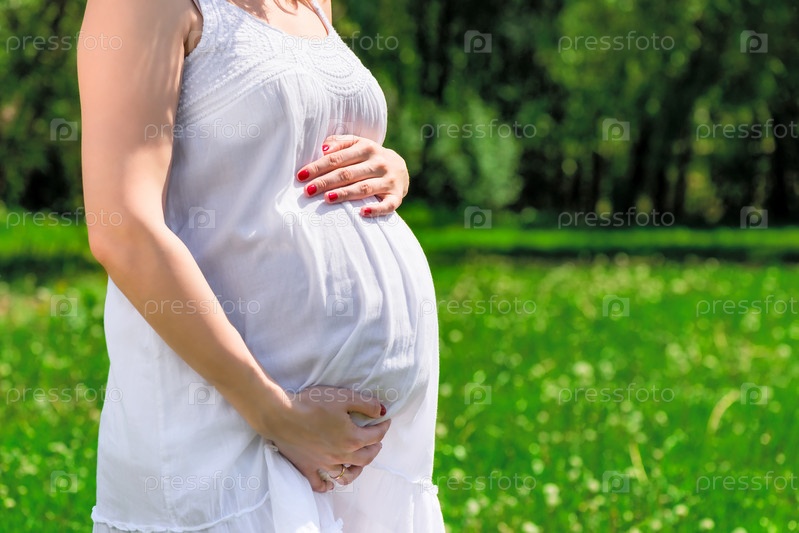 Живот беременной женщины в белом платье на фоне зеленого парка