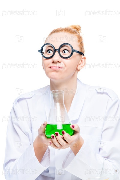 Блондинка в смешных очках позирует с пробиркой