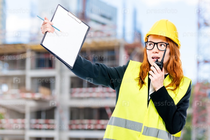 Бригадир с рацией в майке и желтом шлеме на фоне строящегося здания