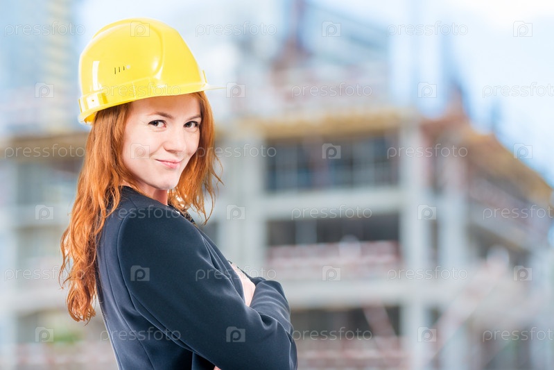 Портрет женщины архитектора в желтом шлеме на строительной площадке