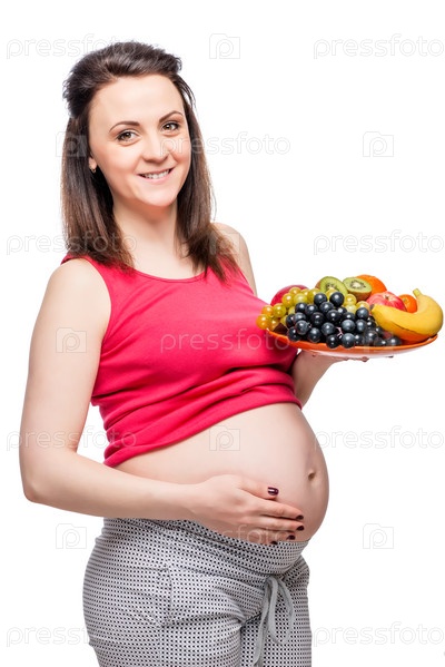 Здоровая счастливая беременная женщина с тарелкой фруктов