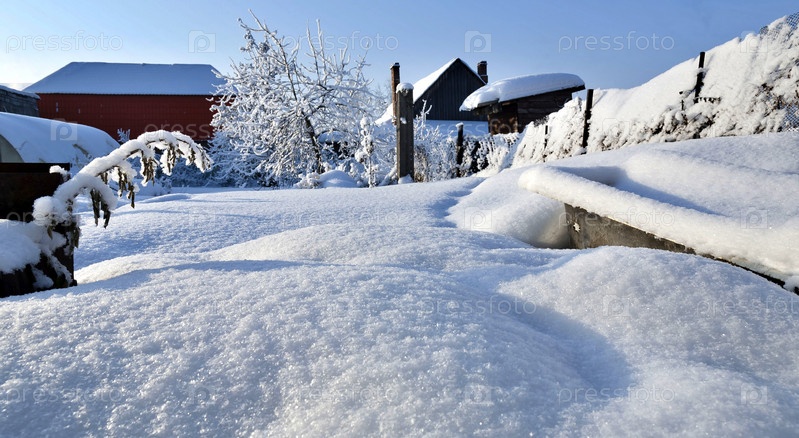 Садовые деревья покрыты пушистым белым снегом