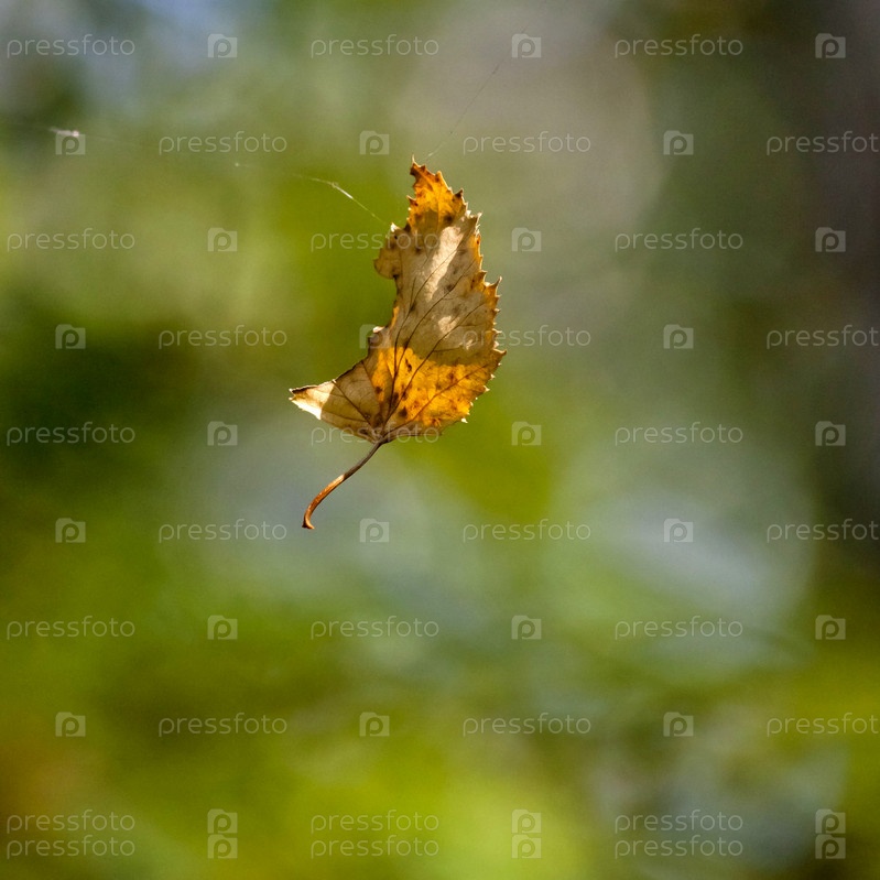 Желтый осенний лист висит на паутине
