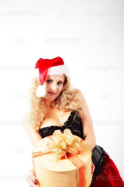 Привлекательная женщина в новогоднем костюме предлагает подарок. Студия