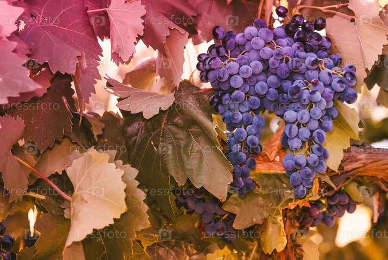 Фиолетовый виноград с зелеными листьями