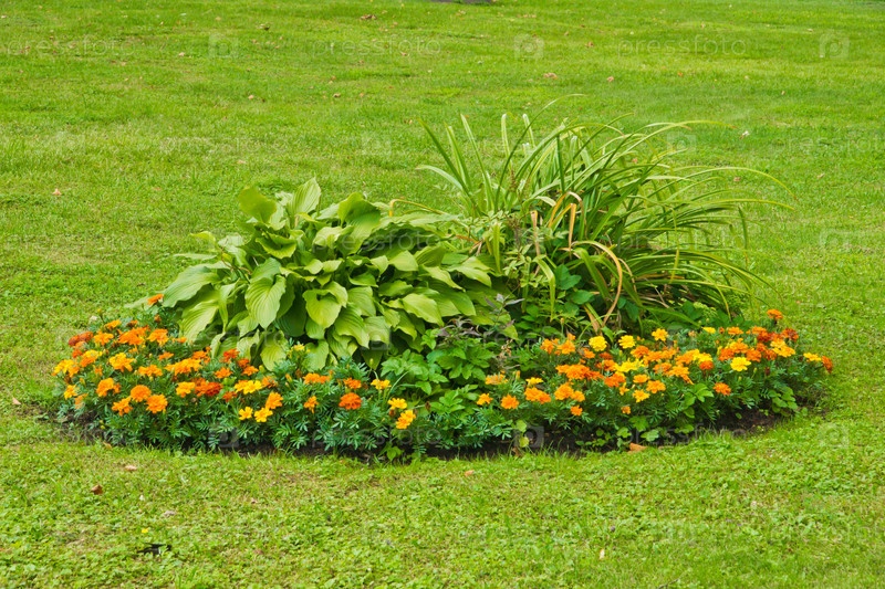 Клумба на зеленой лужайке