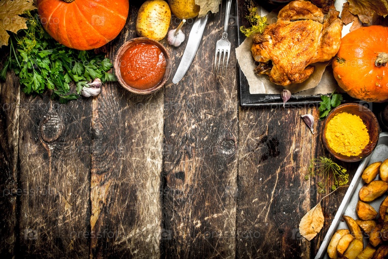Жареная курица с картофелем, специями и соусом