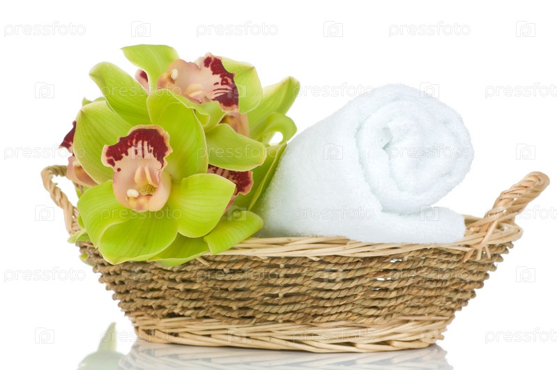 Орхидеи и полотенце в соломенной корзине, изолированные на белом фоне