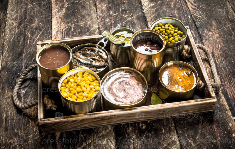 Различные консервированные фрукты, овощи, рыба и мясо