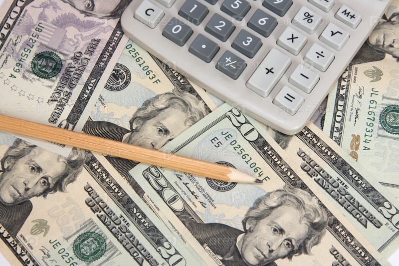 Калькулятор и карандаш на двадцатидолларовых купюрах