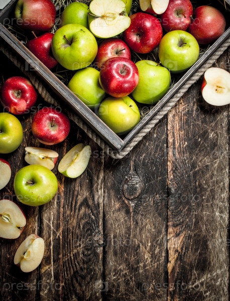 Коробка со свежими красными и зелеными яблоками