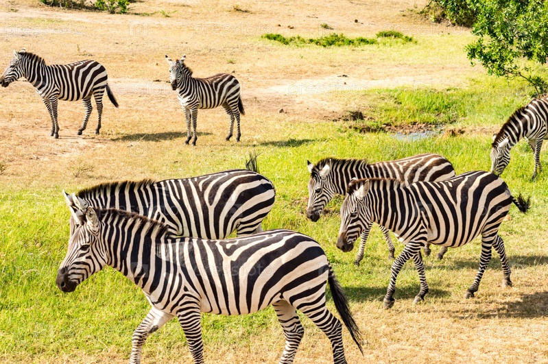 Стадо зебр пасется в саванне Масаи Мара парка в Кении