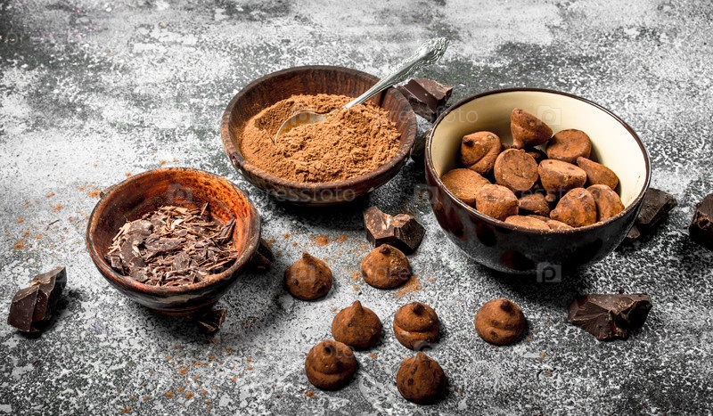Шоколадные трюфели, какао-порошок и тертый шоколад
