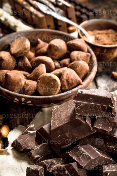 Различные виды шоколада, какао-порошок и кусочки темного шоколада