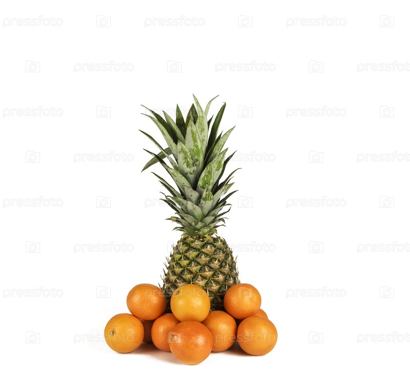 Ананас и несколько мандаринов на белом фоне