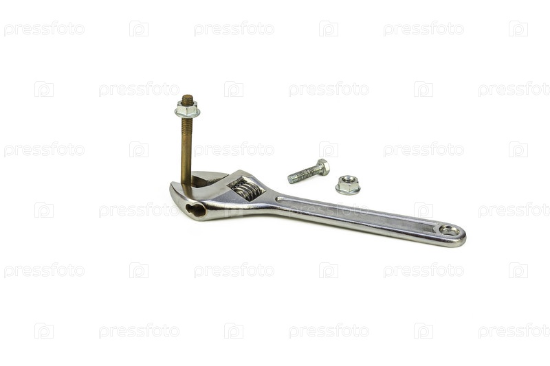 Разводной ключ с зажатым болтом и гайками на белом фоне