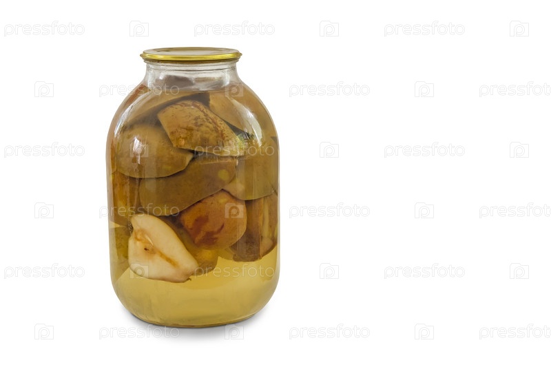 Консервированные груши в стеклянной банке на белом фоне