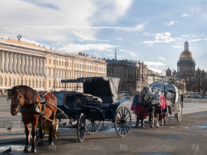 Лошади запряжены в карету и кабриолет на Дворцовой площади в Санкт-Петербурге