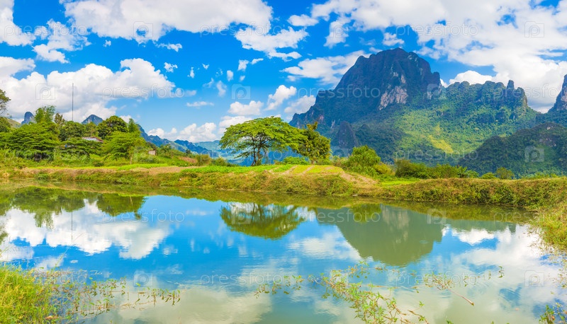 Красивый пейзаж и пруд, Лаос