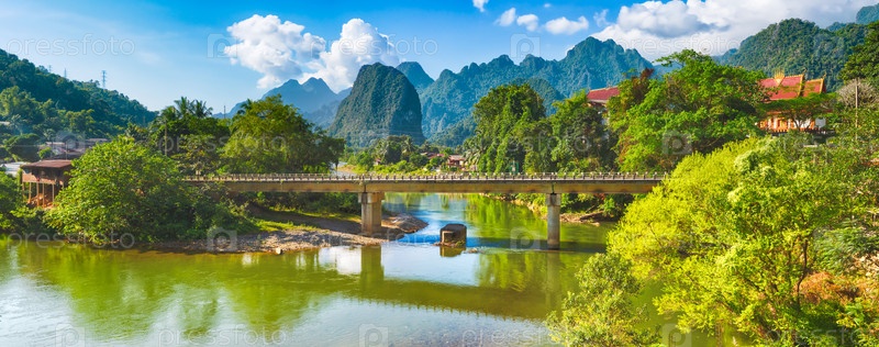 Удивительный пейзаж реки среди гор. Лаос