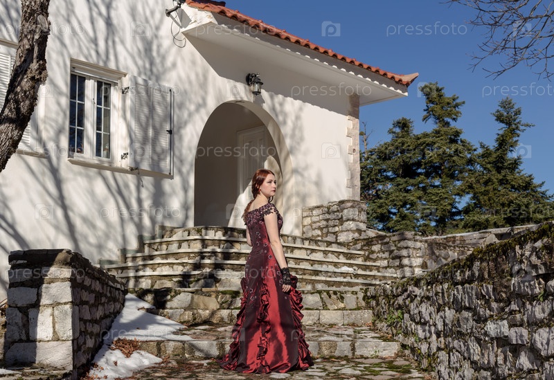 Молодая, красивая девушка на ступеньках дома в старинном бордовом платье