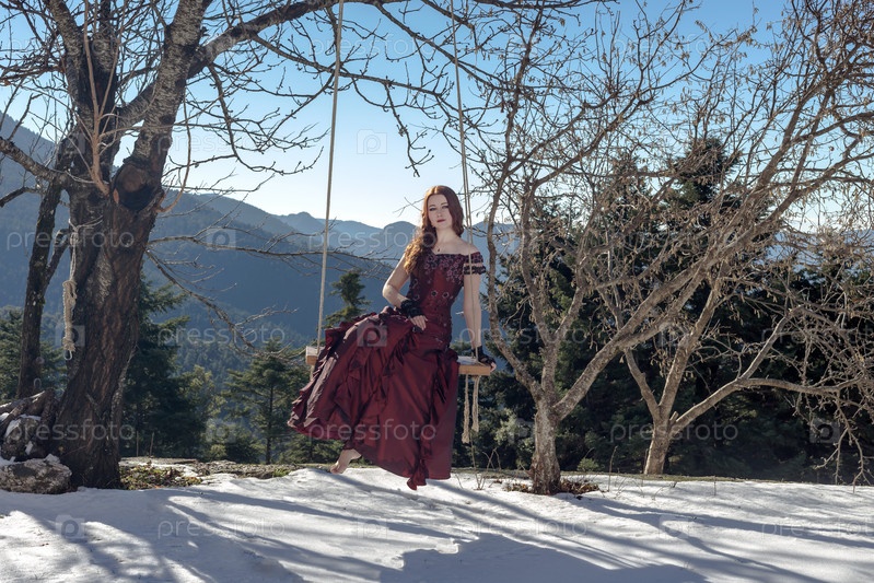 Молодая, красивая девушка на качелях