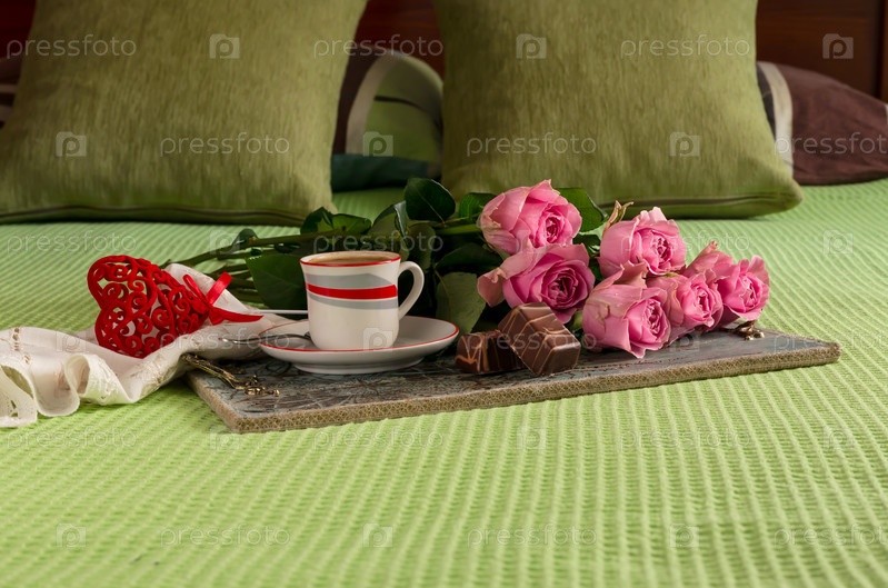 Лоток с чашкой кофе, сладостями и букетом из розовых роз