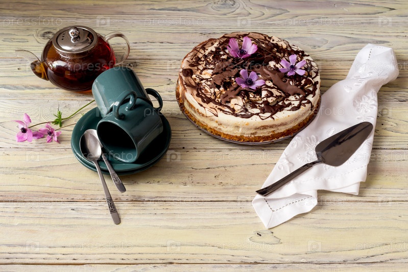 Торт, чайник с чаем и чашками
