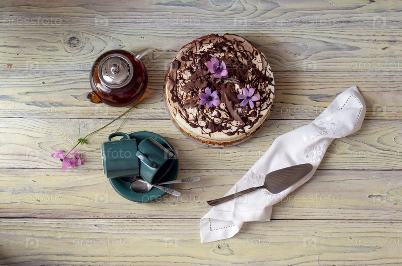 Торт, чайник с чаем и чашками