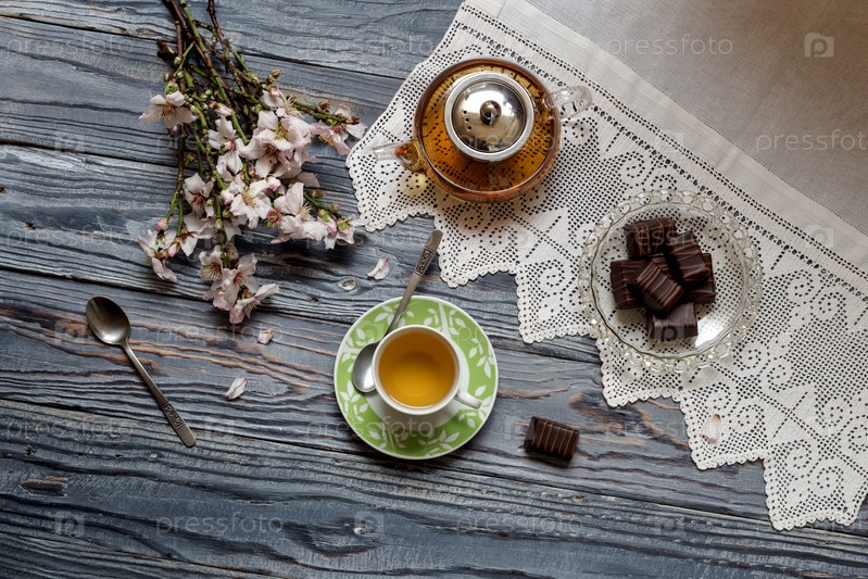 Горячий травяной чай, конфеты и цветы