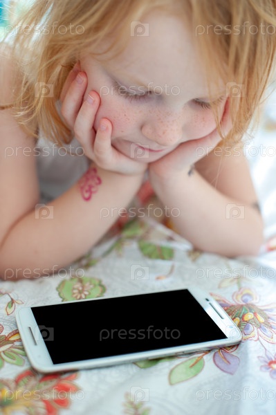 Рыжая девочка смотрит на телефон