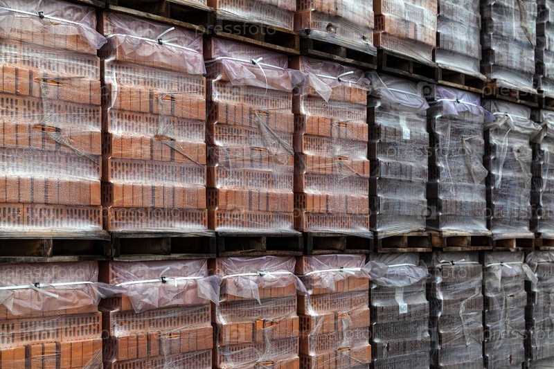 Кирпич, склад строительных материалов, палета кирпичей в пленке на поддоне