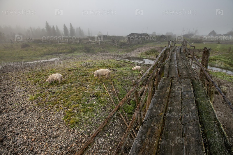Горный Алтай, Старый деревянный мост в таежной деревне. Поросята гуляют по берегу